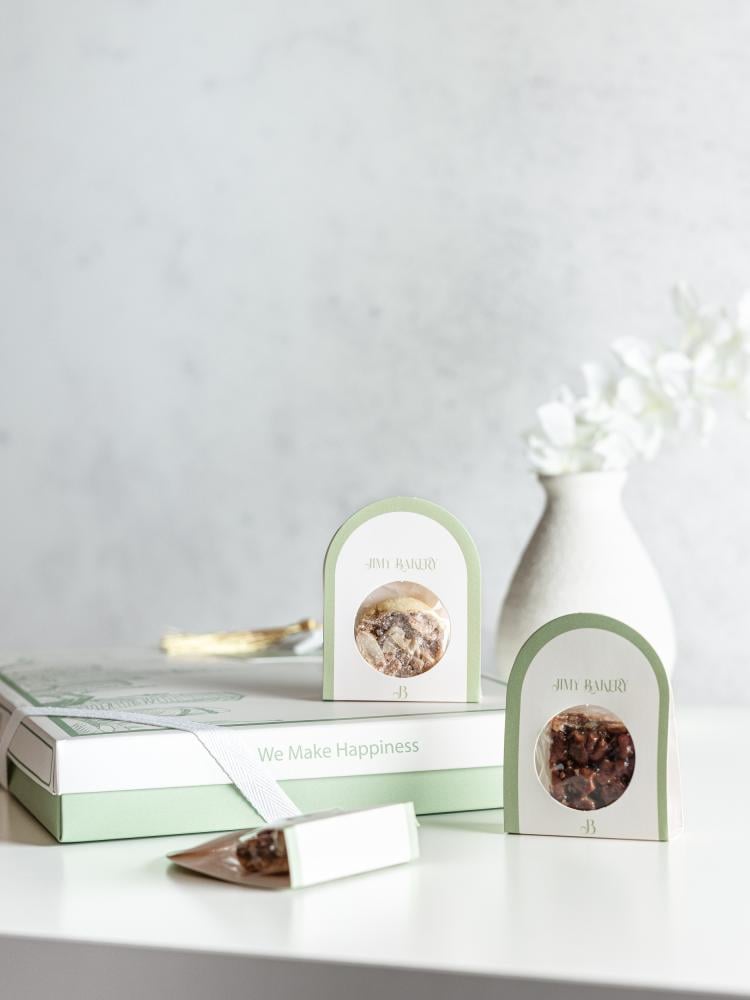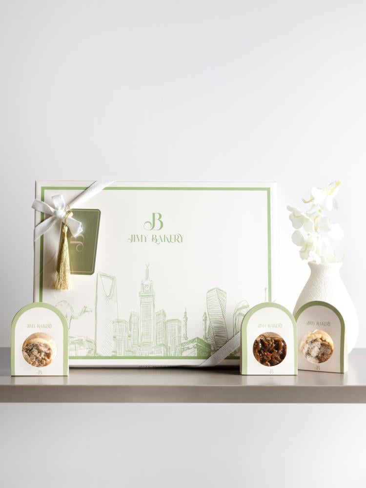 صندوق انيق يحتوي على 18 علبة صغيرة انيقة بها قطعة واحدة مغلفة من التارت الفاخر ( بيكان بار ، تارت التمر و المكسرات ) .