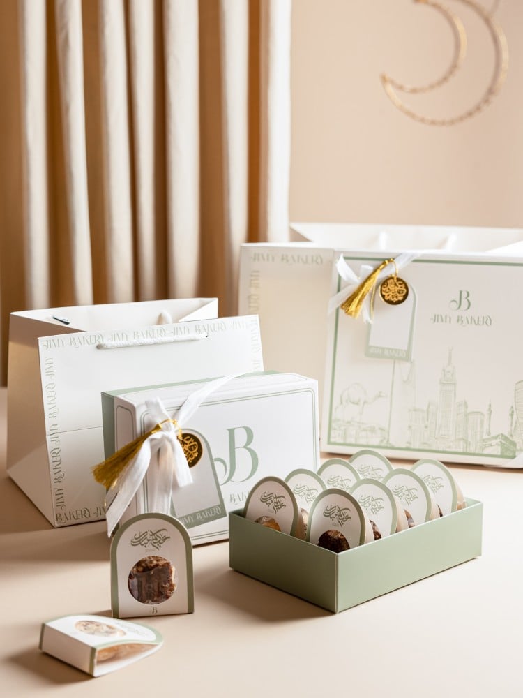 صندوق انيق يحتوي على 8 علب صغيرة بعبارة ( عيدكم مبارك) بها قطعة واحدة مغلفة من التارت الفاخر ( بيكان بار ، تارت التمر و المكسرات ) .